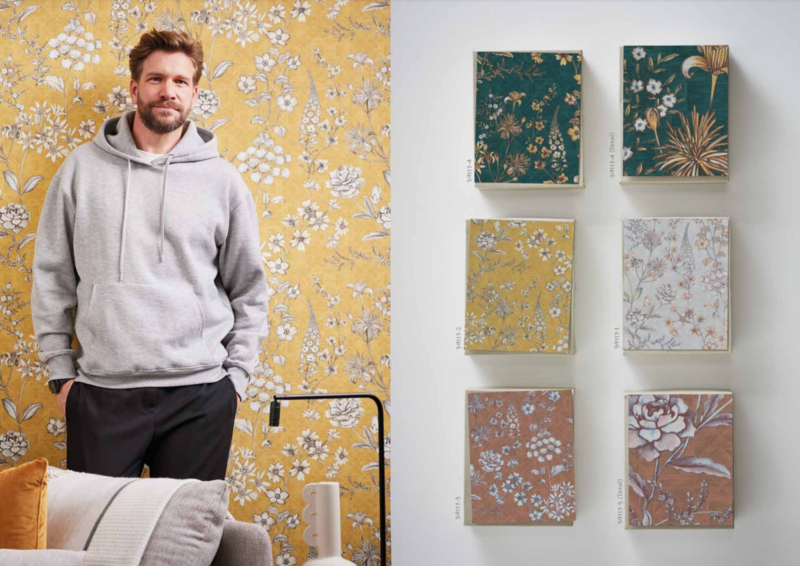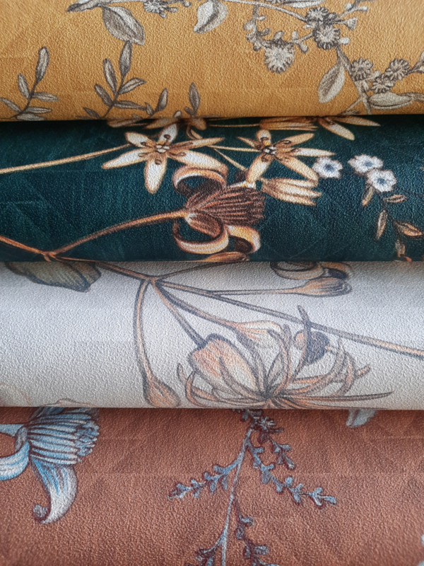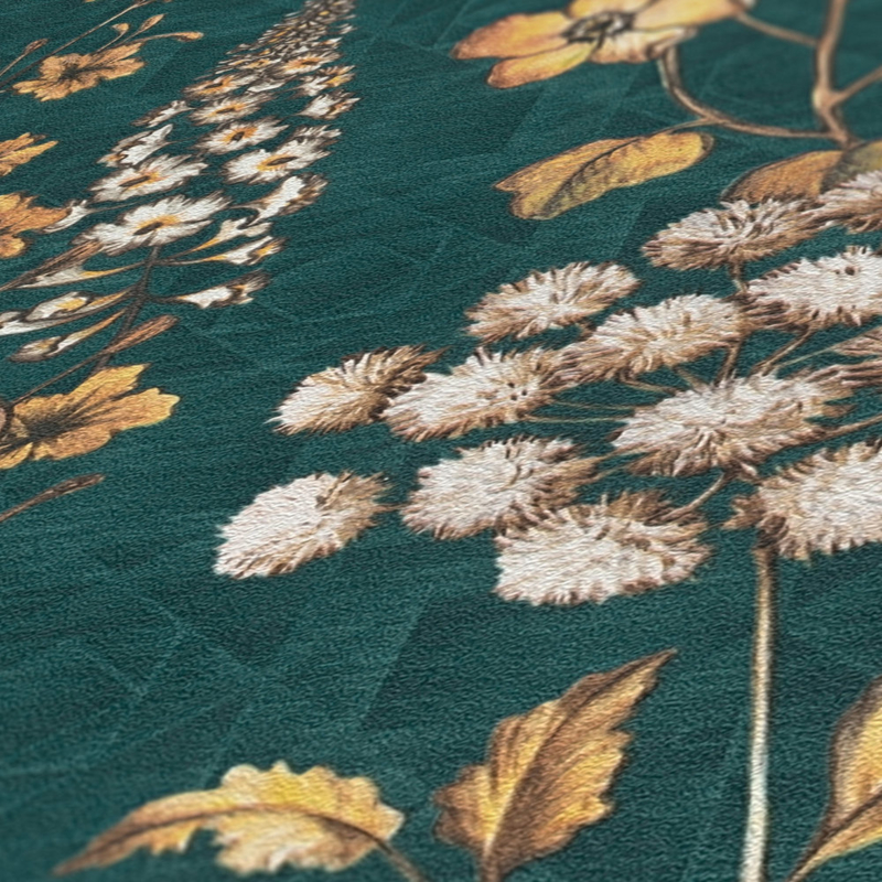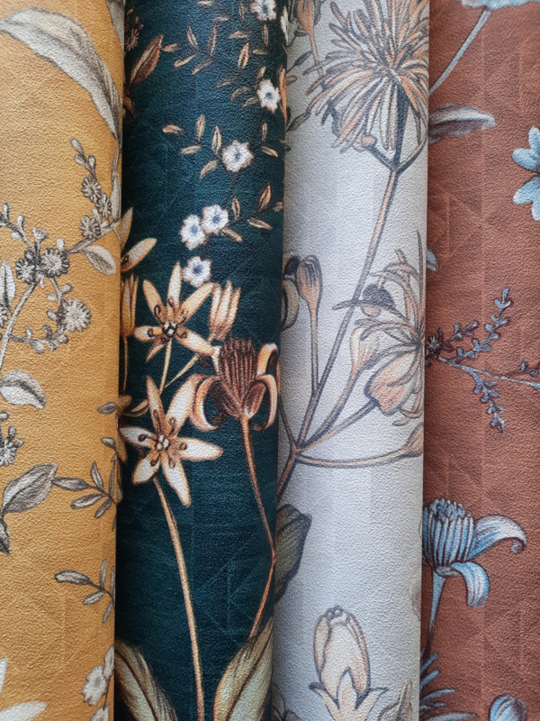 fijn gestructureerd behang, petrol, geel, oranje, bruin, wit