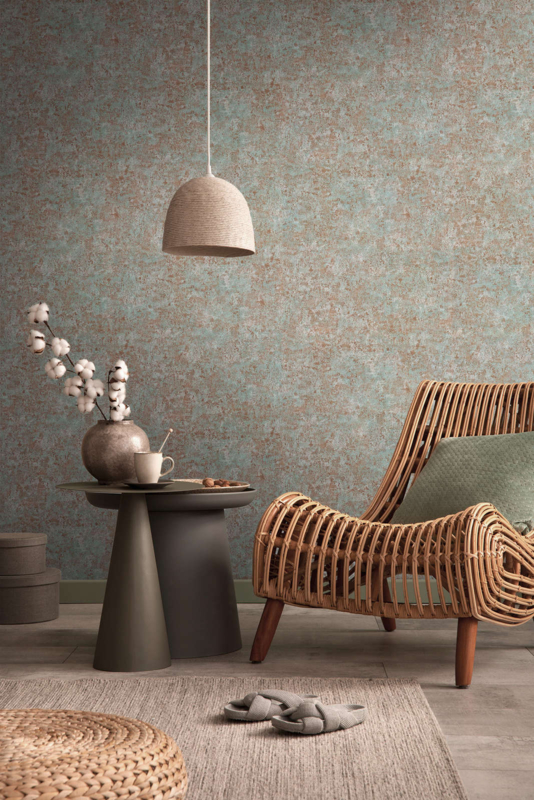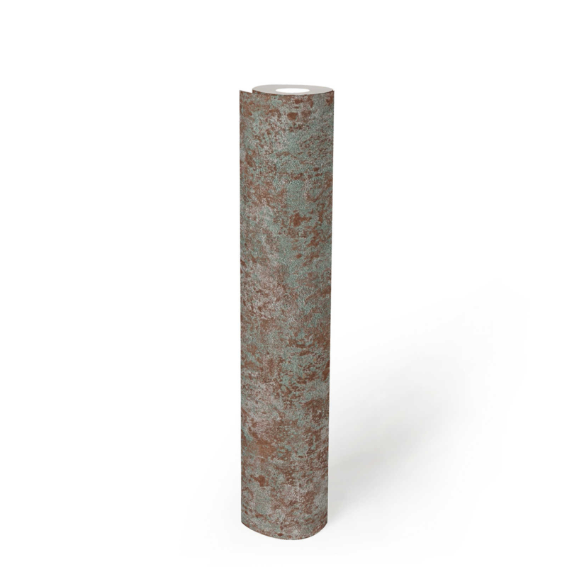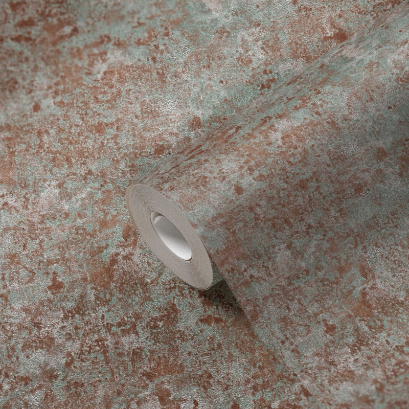 Metaaleffect bruin, groen en zilver gestructureerd behang. Industrieel en stoer